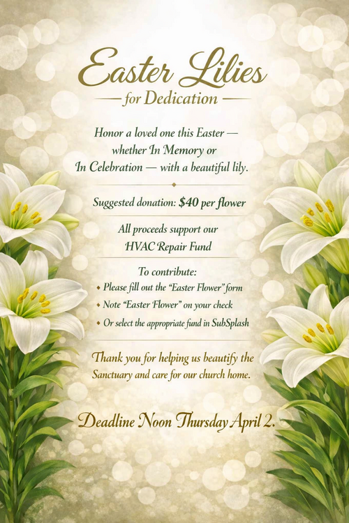 Easter Morning SonRise Service will be held ON THE CHURCH LAWN at 6:30 AM (NOT AT THE LAKE). This casual service will be brief and include hymns, prayer, and a message from Rev. Thomas, followed by a Fellowship Breakfast in the Conference Room.