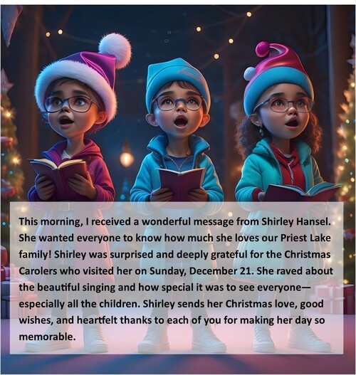 On behalf of all your church staff, I want to express our deep gratitude and appreciation for the very generous staff gifts we have received. It is a privilege and a pleasure to serve alongside all of you as your share your numerous talents, give your precious time, and support one another as members and friends of the Priest Lake Presbyterian Church. 2025 has been a year with many changes. We are so thankful that those essential and amazing things about PLPC – love, caring, welcome, hospitality, helping and supporting persons who are vulnerable or in need, vibrant worship of God, table fellowship, generosity, commitment to serving Christ – have not changed. You are a good and faithful church!